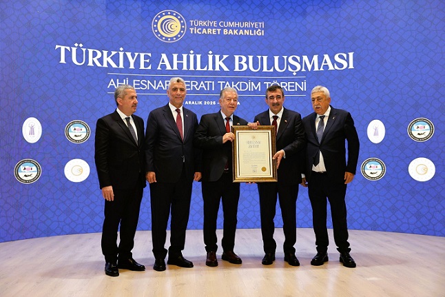 Ticaret Bakanlığı tarafından Ankara'da düzenlenen Türkiye Ahilik Buluşması törenine katılan İzmir Esnaf ve Sanatkarlar Odaları Birliği (İESOB) Başkanı Yalçın Ata' ya 'Ahi Esnaf Beratı' Cumhurbaşkanı Yardımcısı Cevdet Yılmaz tarafından takdim edildi.